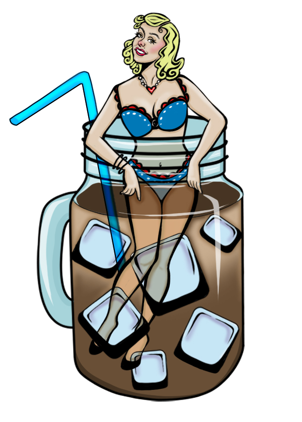 The core graphic centers on a retro pin-up figure relaxing in an iced coffee mug, merging warmth and chill in a single playful image. Designed for screen printing and sticker use, the circular badge layout ensures the artwork reads clearly from a distance while still rewarding close-up detail.