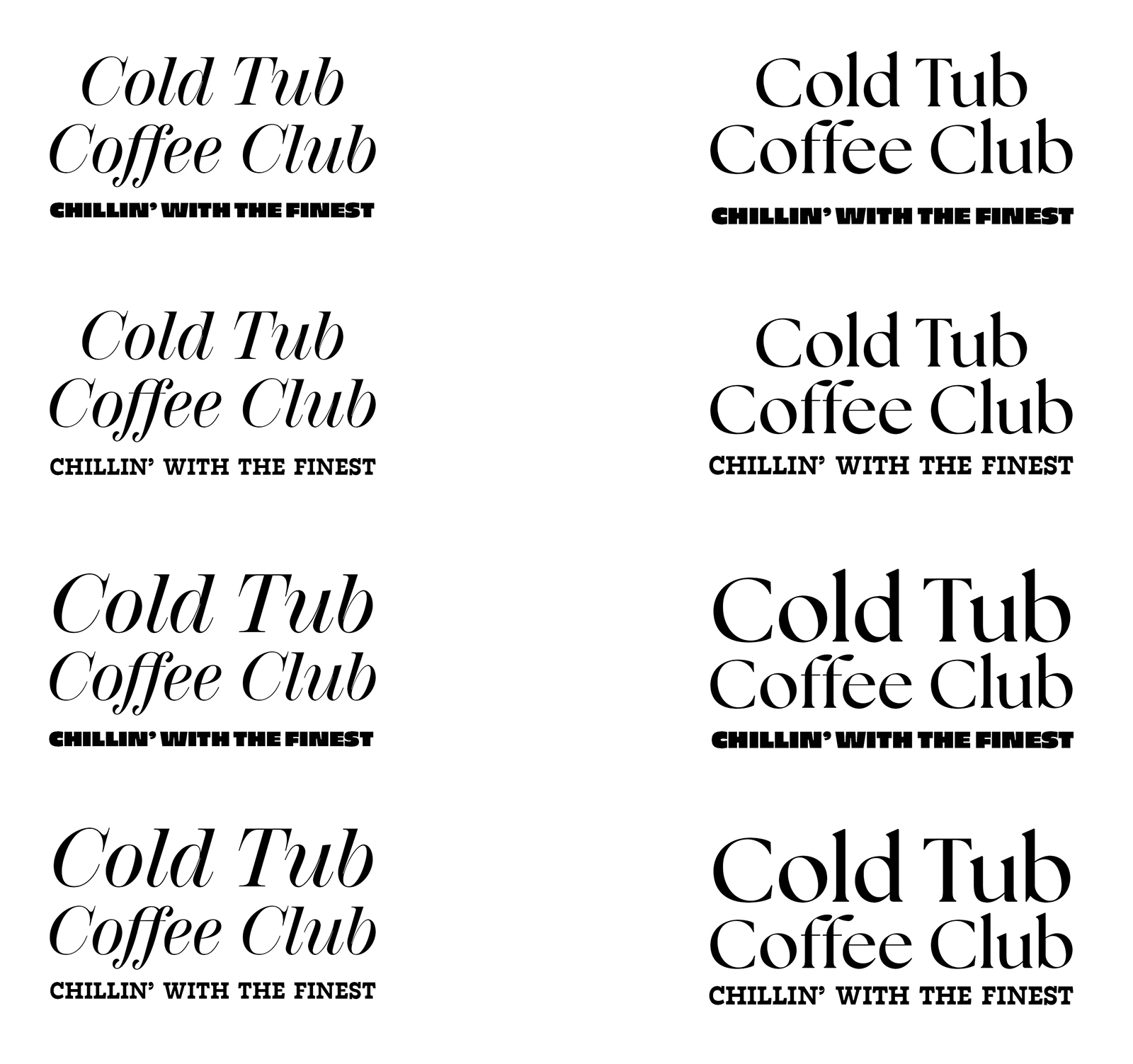 Multiple typographic lockups were tested to find the right balance between elegance and impact. Pairing a refined serif for the club name with a bold, blocky all-caps tagline created a clear hierarchy that stays legible across shirts, signage, and small stickers.