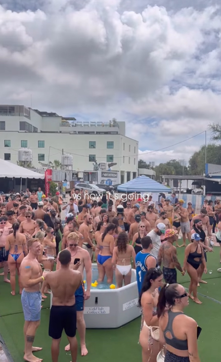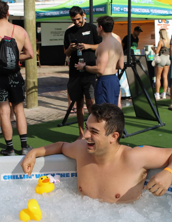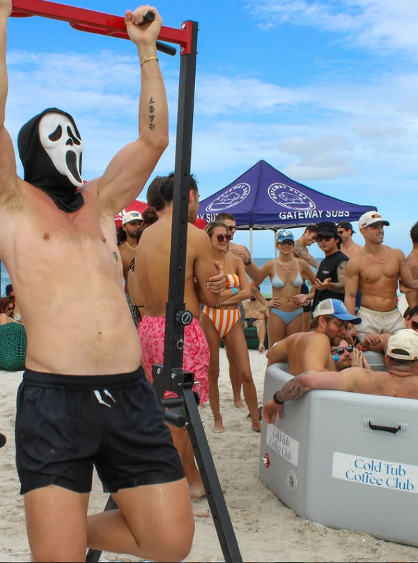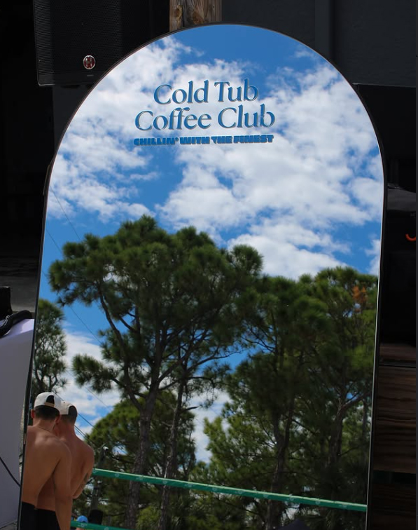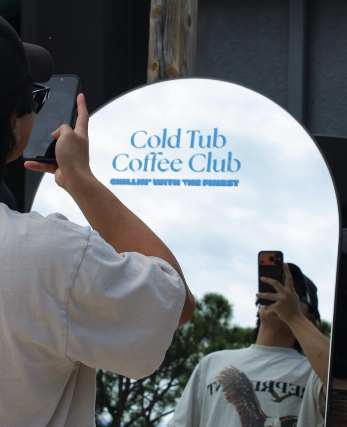 These photos capture the real Cold Tub Coffee Club experience: crowded beach meetups, ice baths, coffee in hand, and strangers quickly becoming friends. The branding appears naturally in the environment, from tub decals to mirrors and signage, showing how the identity lives within candid, high-energy moments rather than staged advertising.