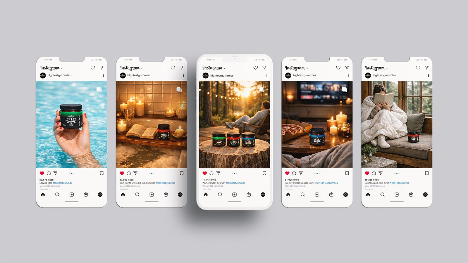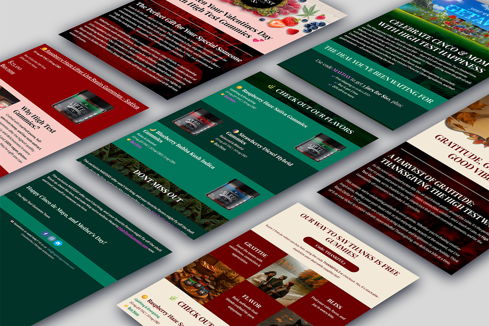 High Test Gummies is an exclusively online live-resin Delta-9 brand built around three targeted experiences: Lifter for energy and focus, Balance for an even, feel-good calm, and Sleep for deep nightly recovery. This section highlights a cohesive digital marketing system spanning social content, paid ads, email campaigns, website visuals, and direct response graphics, all designed to communicate each product’s distinct benefit while maintaining a unified, premium lifestyle aesthetic. Seasonal promotions, flavor spotlights, and educational blog content work together to build trust and drive conversions, presenting the gummies not just as a product but as part of everyday routines for productivity, relaxation, and rest.