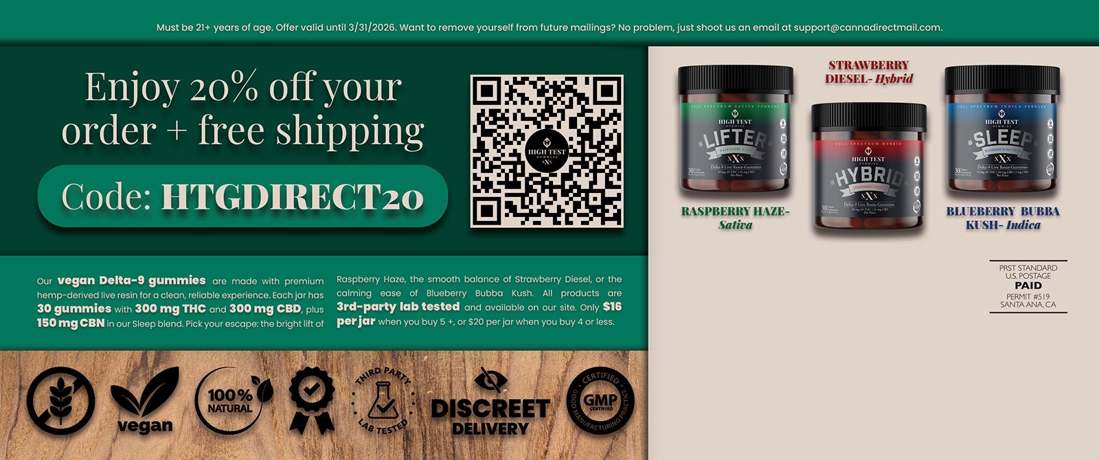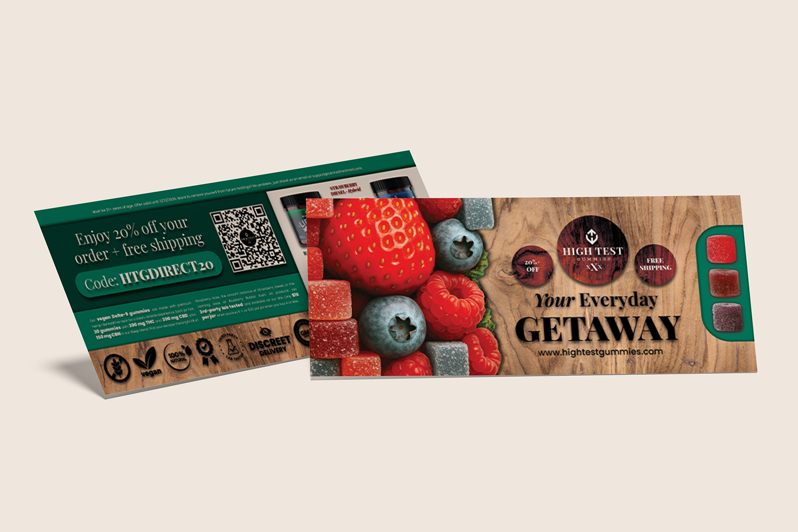 To reach customers beyond algorithm-driven platforms, I designed and deployed a nationwide direct mail flyer targeting cannabis consumers in compliant markets. The piece combines bold product photography, clear flavor differentiation, and a strong promotional offer with a scannable QR code that drives recipients directly to the online store. Careful attention was given to compliant, non-explicit wording while still communicating quality, lab testing, vegan ingredients, and discreet shipping. This tactile, high-impact format created an additional acquisition channel, bridging offline discovery with online conversion through trackable codes and URLs.