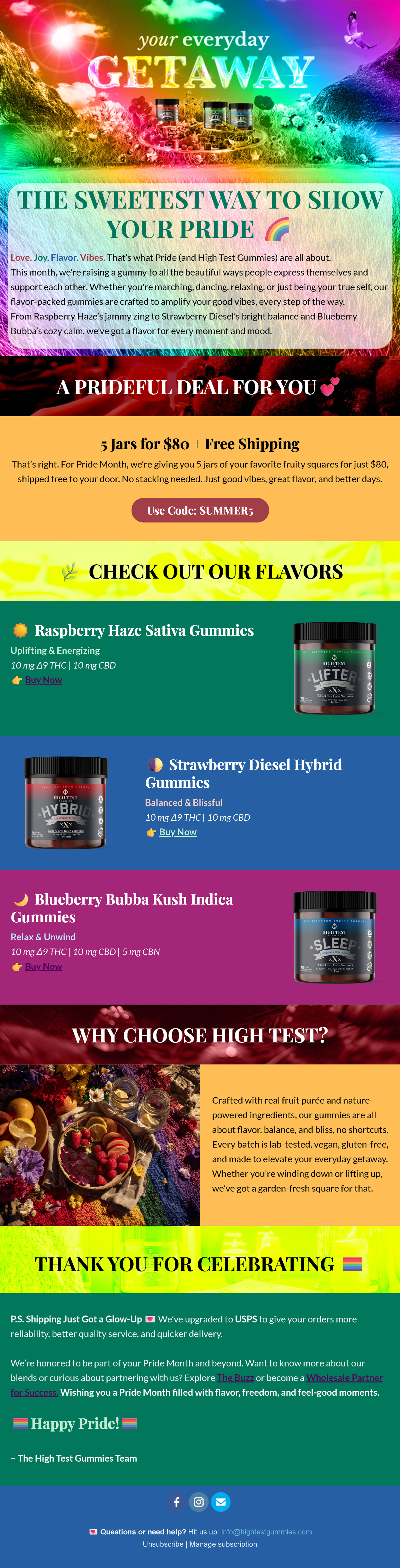 Email newsletters became a core channel for driving repeat purchases and staying top-of-mind with an exclusively online audience. Each campaign was built around seasonal moments and cultural touchpoints (Halloween, Thanksgiving, Valentine’s Day, Pride Month, and New Year), pairing immersive visuals with soft, lifestyle-focused copy that highlighted flavor, mood, and experience rather than explicit cannabis language. This approach kept content engaging and compliant while still clearly communicating product benefits and limited-time offers.