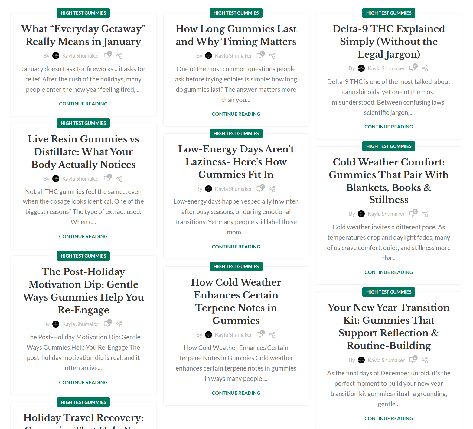 To support long-term organic growth, I developed and published 100+ fully SEO-optimized blog posts, released twice weekly to build topical authority and consistent traffic. Each article translates complex cannabis topics into clear, approachable language while strategically targeting high-intent search queries around Delta-9, live resin, effects, routines, and lifestyle use cases. By combining keyword research, internal linking, structured formatting, and conversion-focused CTAs, the blog functions as both an educational resource and a performance marketing channel, capturing search demand, improving rankings over time, and guiding readers from curiosity to confident purchase.