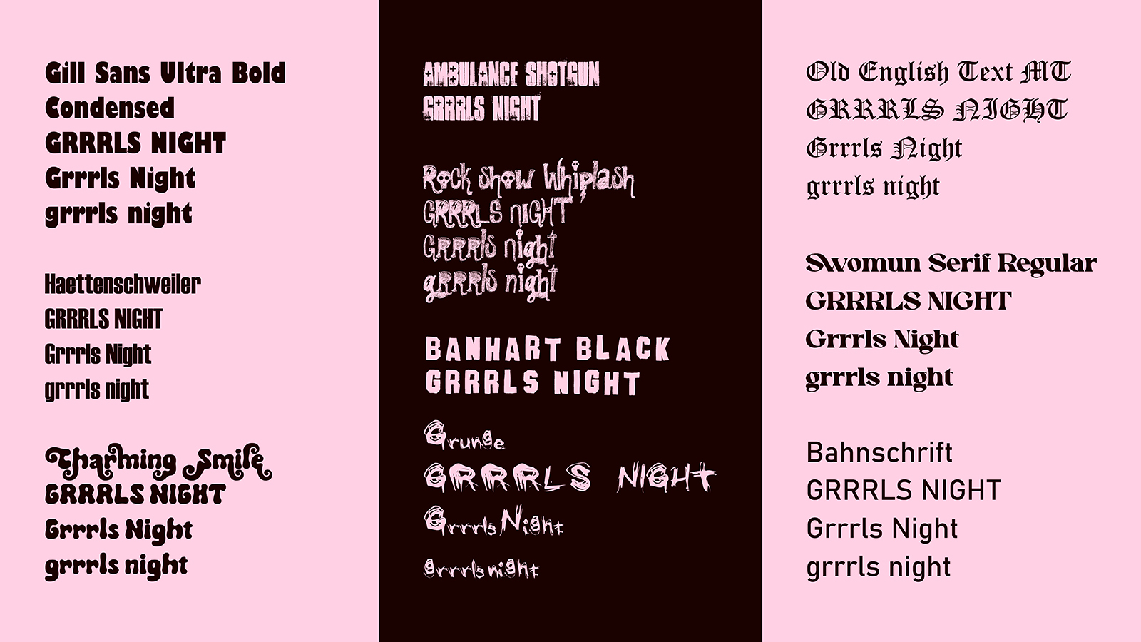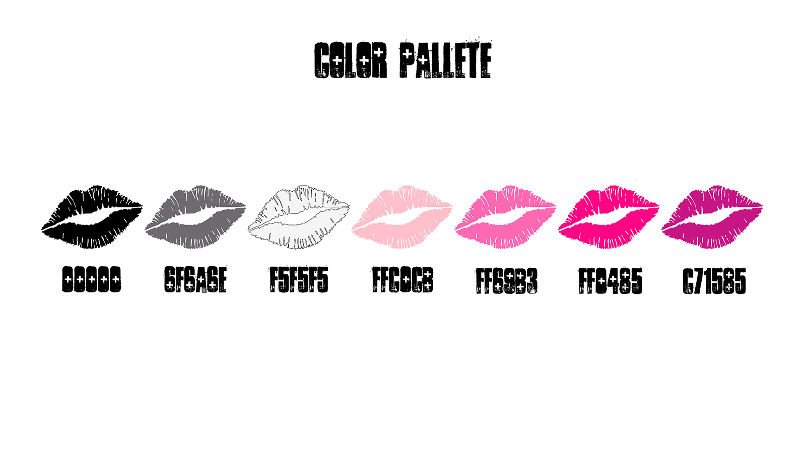 For Grrrls Night, a local event celebrating femme and queer artists, I developed a raw, expressive logo and brand kit that captures the energy of DIY music culture and underground art scenes. The core visual is a lip silhouette I physically created using black lipstick on paper, then scanned and converted into a high-contrast bitmap to preserve its gritty, tactile texture. This analog-to-digital process gives the identity an unapologetically handmade feel that aligns with the event’s focus on authenticity and community. Paired with distressed, heavy typography and a bold palette of hot pinks, blacks, and desaturated neutrals, the system is designed to be loud, flexible, and instantly recognizable across posters, merch, and social graphics while amplifying the voices the event exists to spotlight.