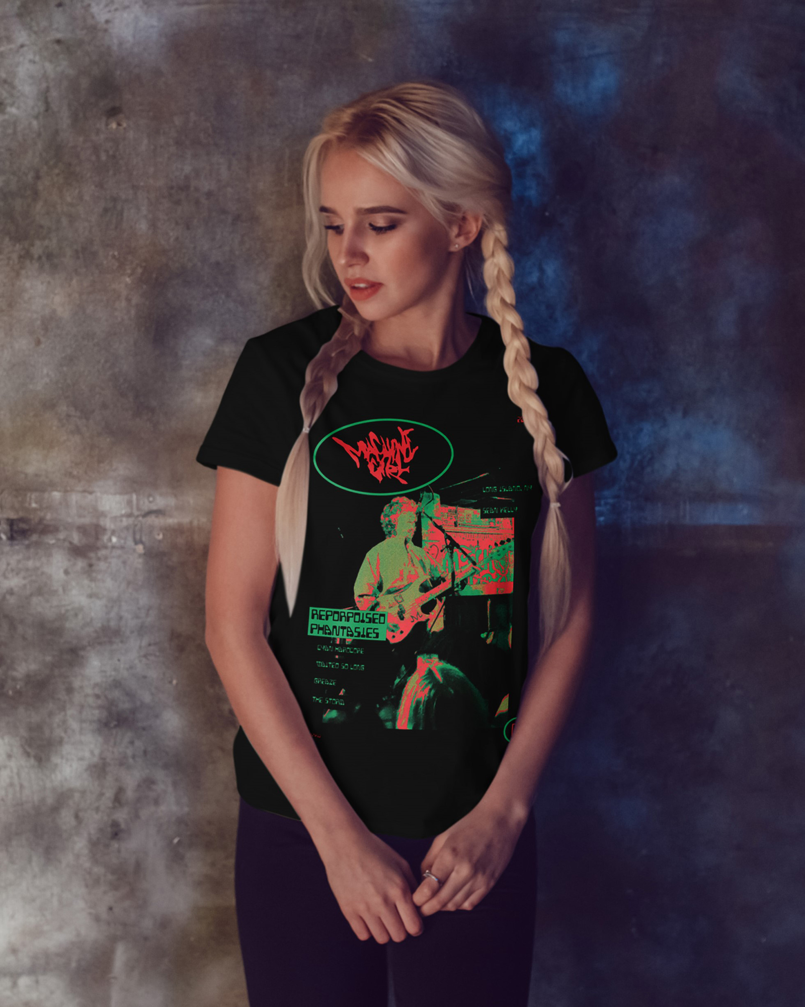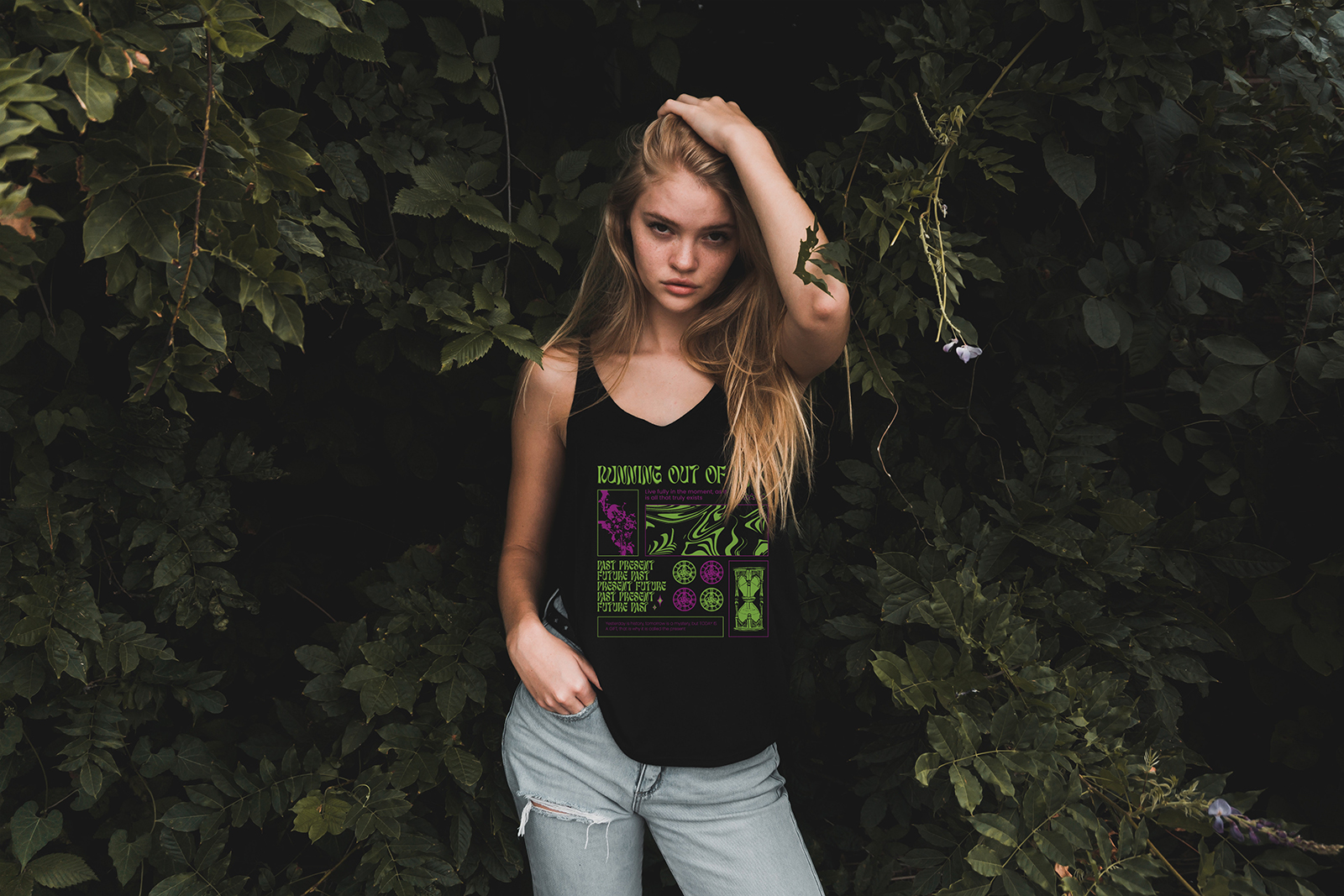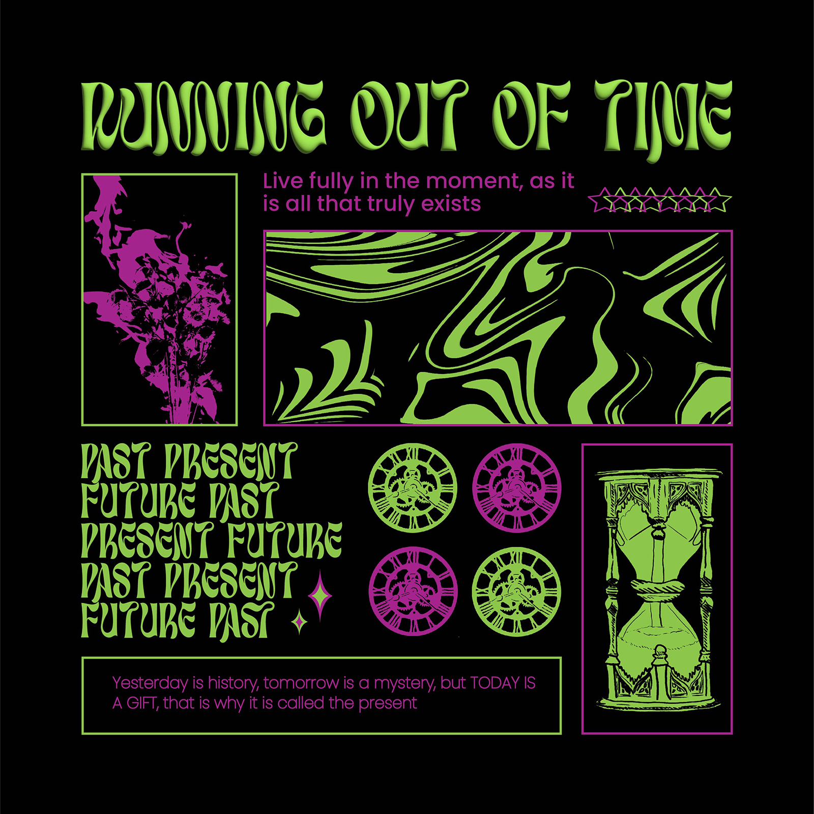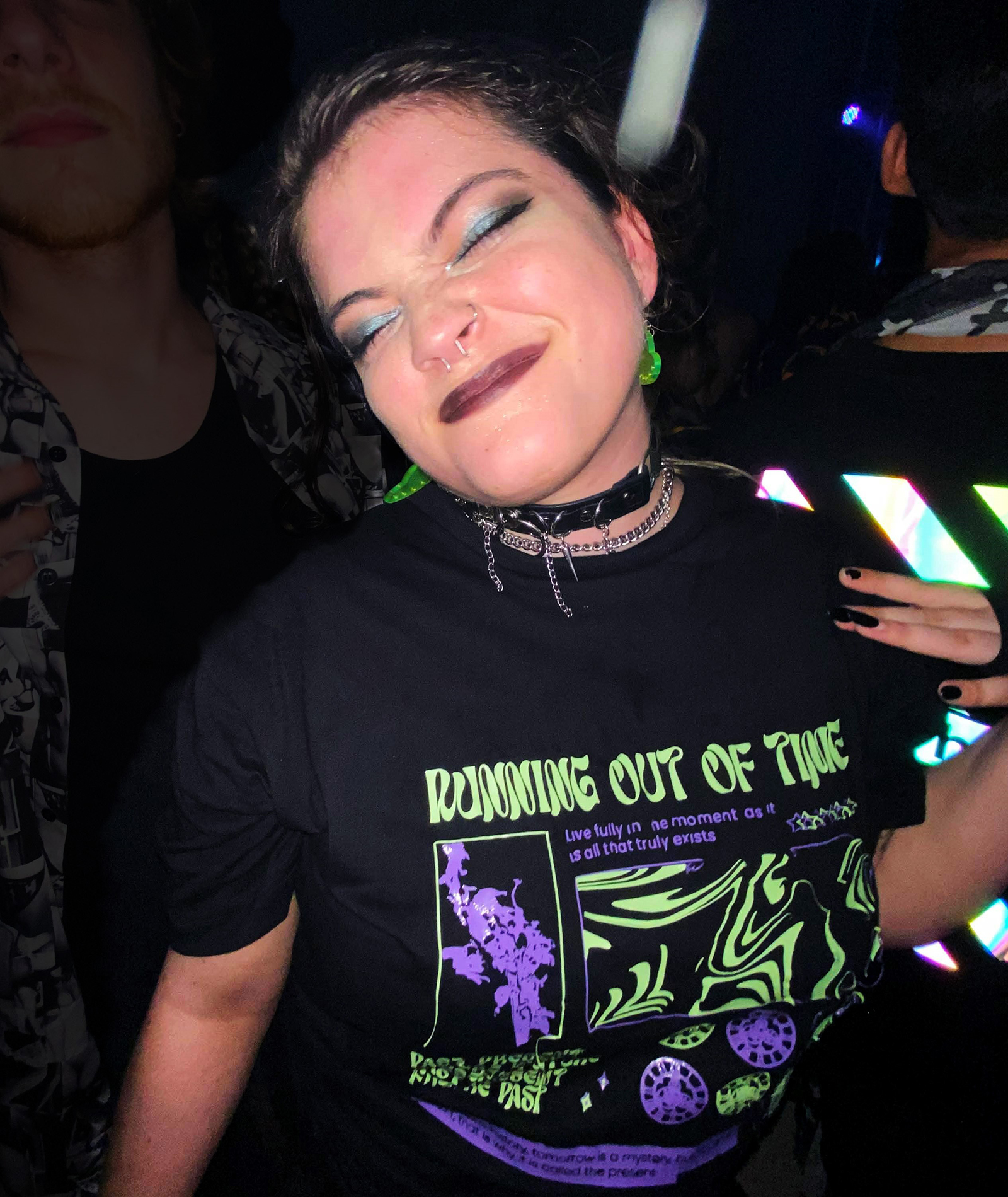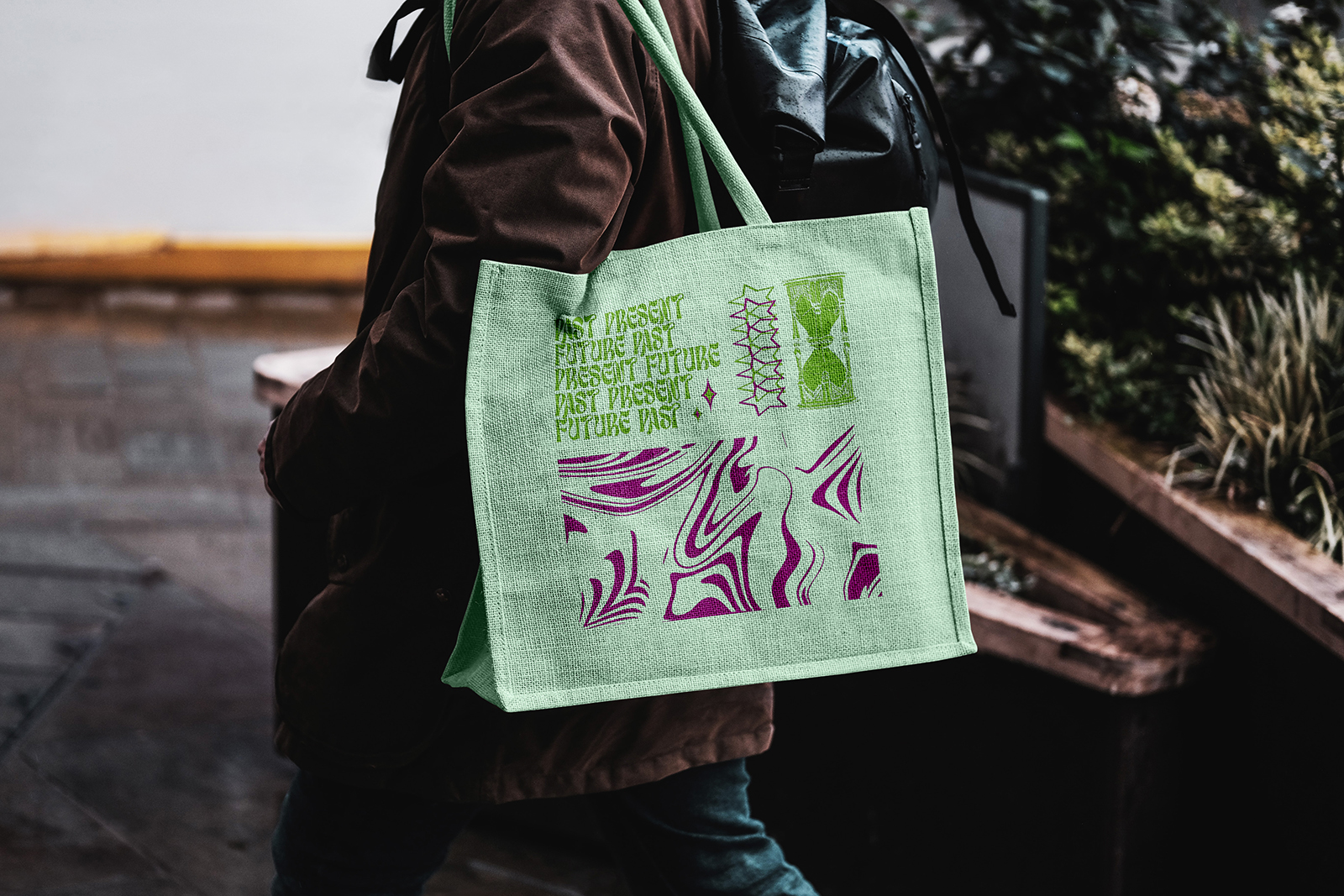 This personal branding project explores a bold, time-bending visual identity applied to apparel and accessories. Centered around a graphic tee and matching tote bag, the design combines distorted typography, psychedelic patterns, and high-contrast neon colors to create a statement look meant for music and nightlife environments. I photographed several of the product shots myself, directing and capturing my friend modeling the shirt at a live concert to showcase how the brand lives and moves in real-world settings.
