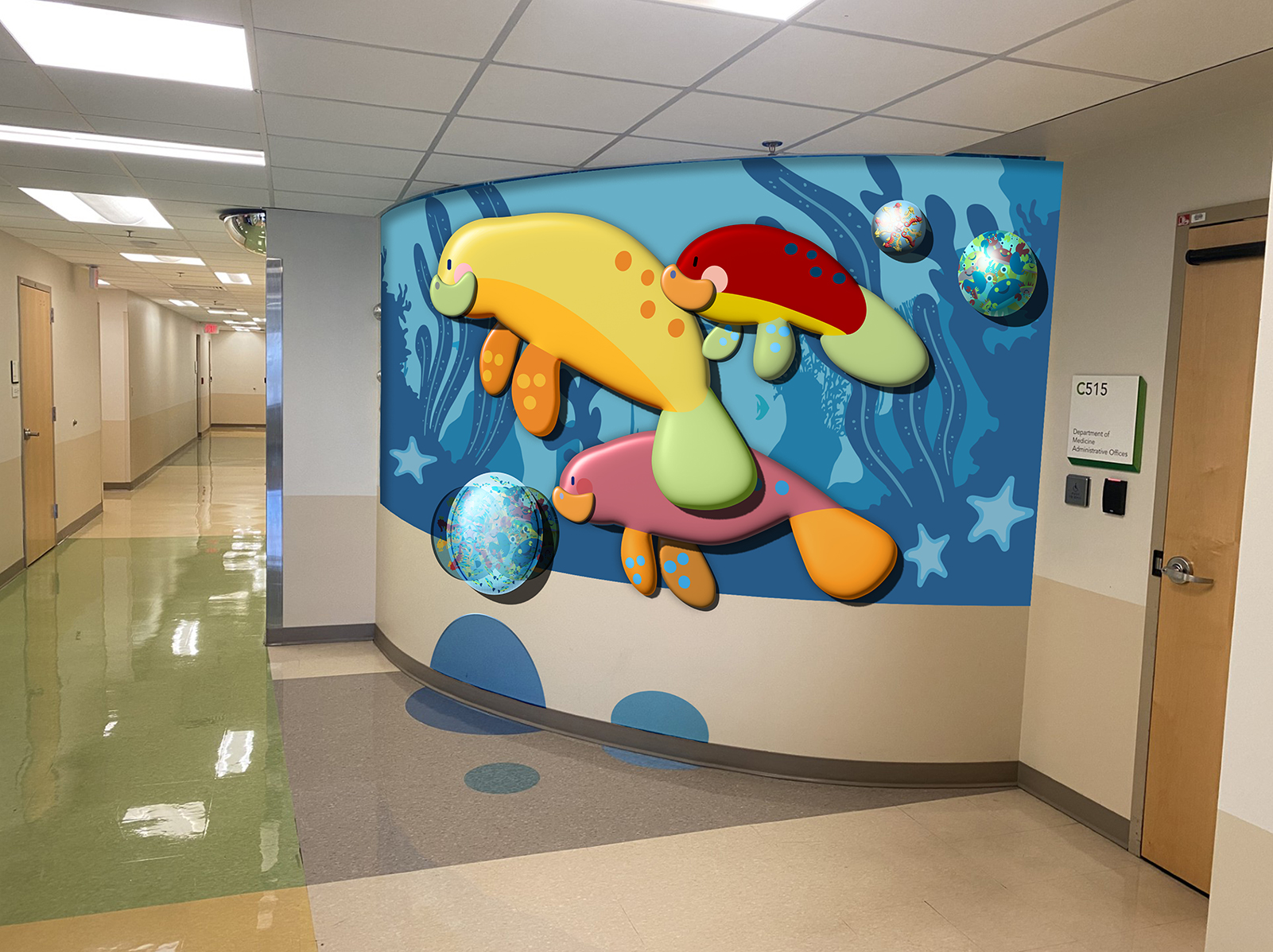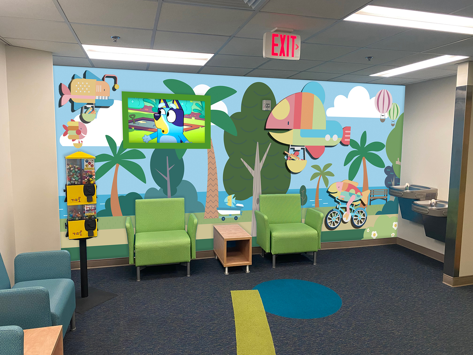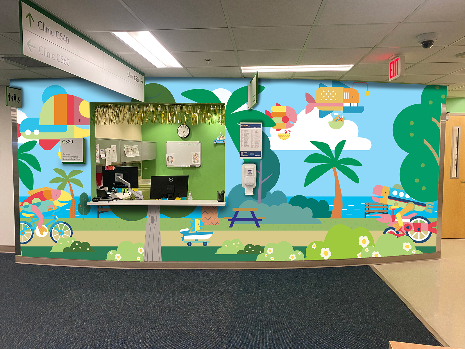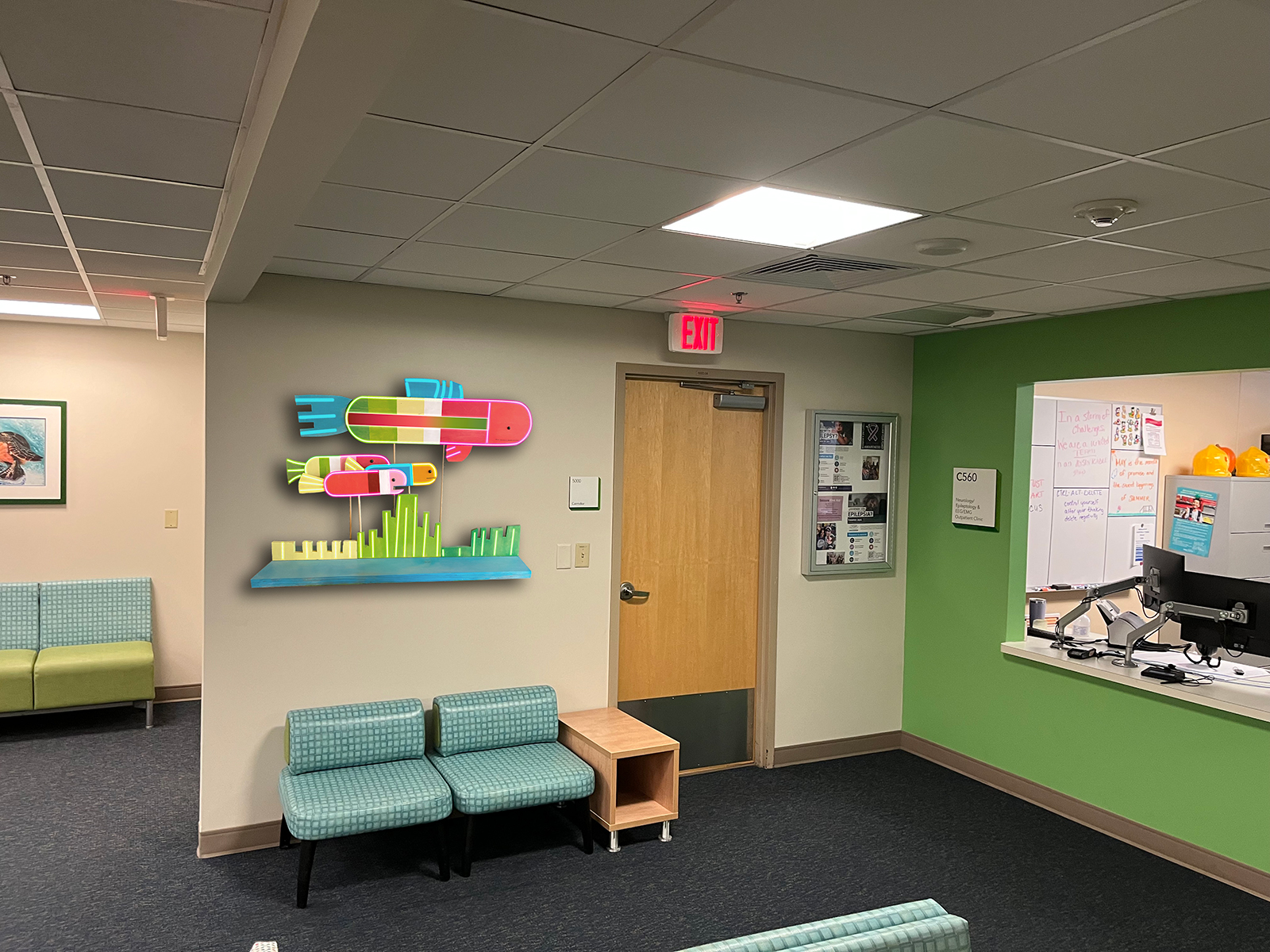 Created while working at Creative Arts Unlimited, this project transformed a children’s hospital waiting area into an immersive, playful environment designed to reduce stress and spark imagination. The space features large-scale illustrated murals of friendly sea creatures, whimsical flying fish, and outdoor adventure scenes that wrap around curved walls to create a cohesive visual journey. Dimensional elements and custom neon-style fixtures add depth and glow, turning flat graphics into engaging focal points that feel almost animated. Bright, approachable colors and soft organic shapes were chosen to create a calming yet uplifting atmosphere, helping young patients and their families feel more comfortable while they wait.