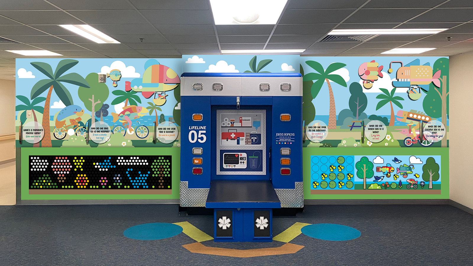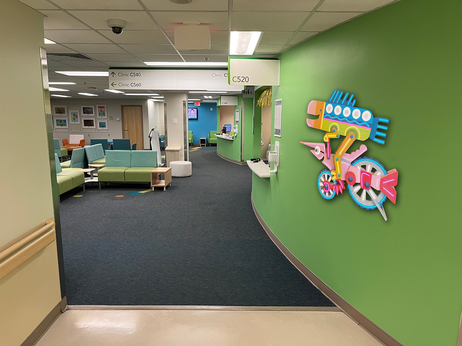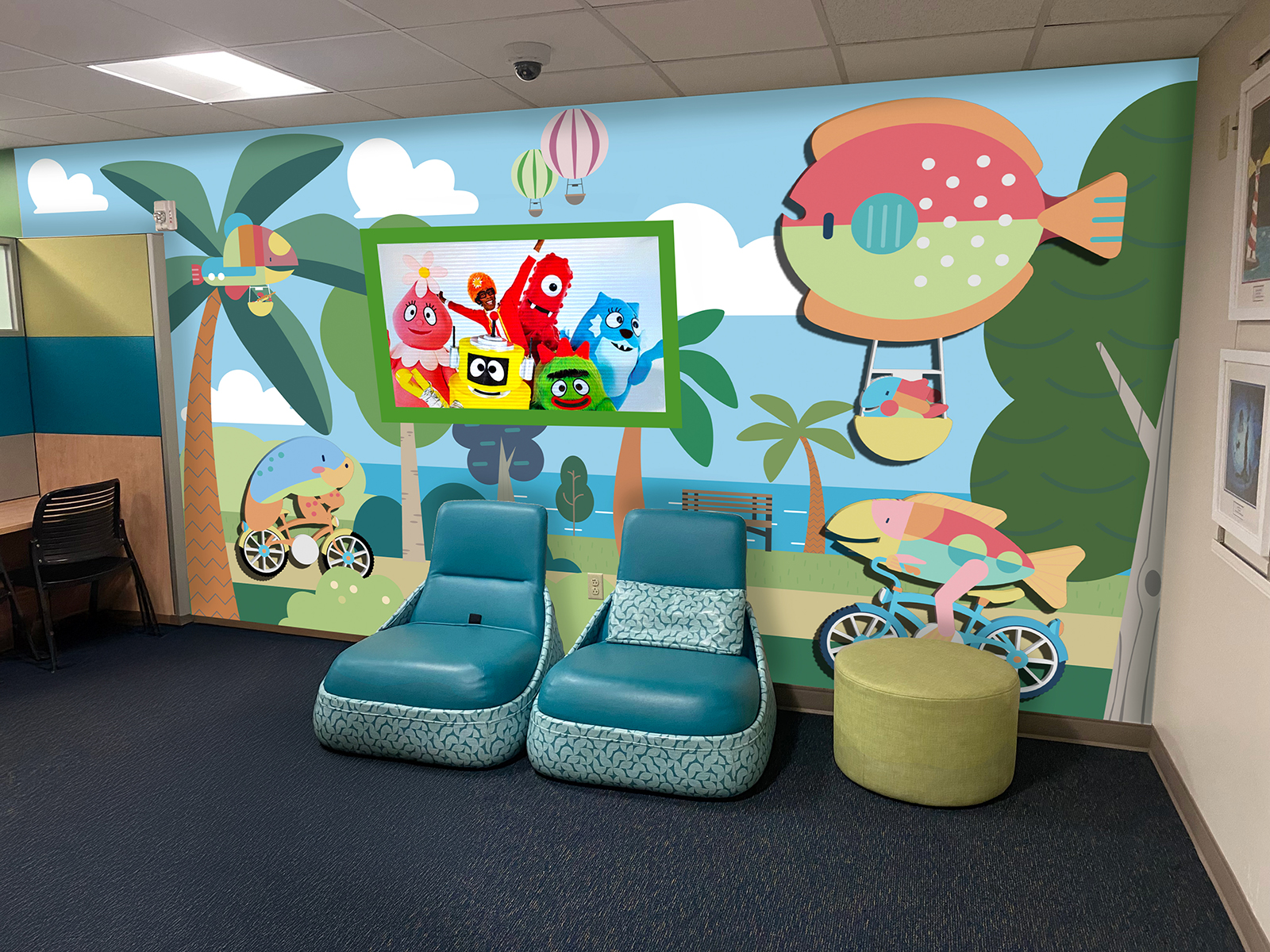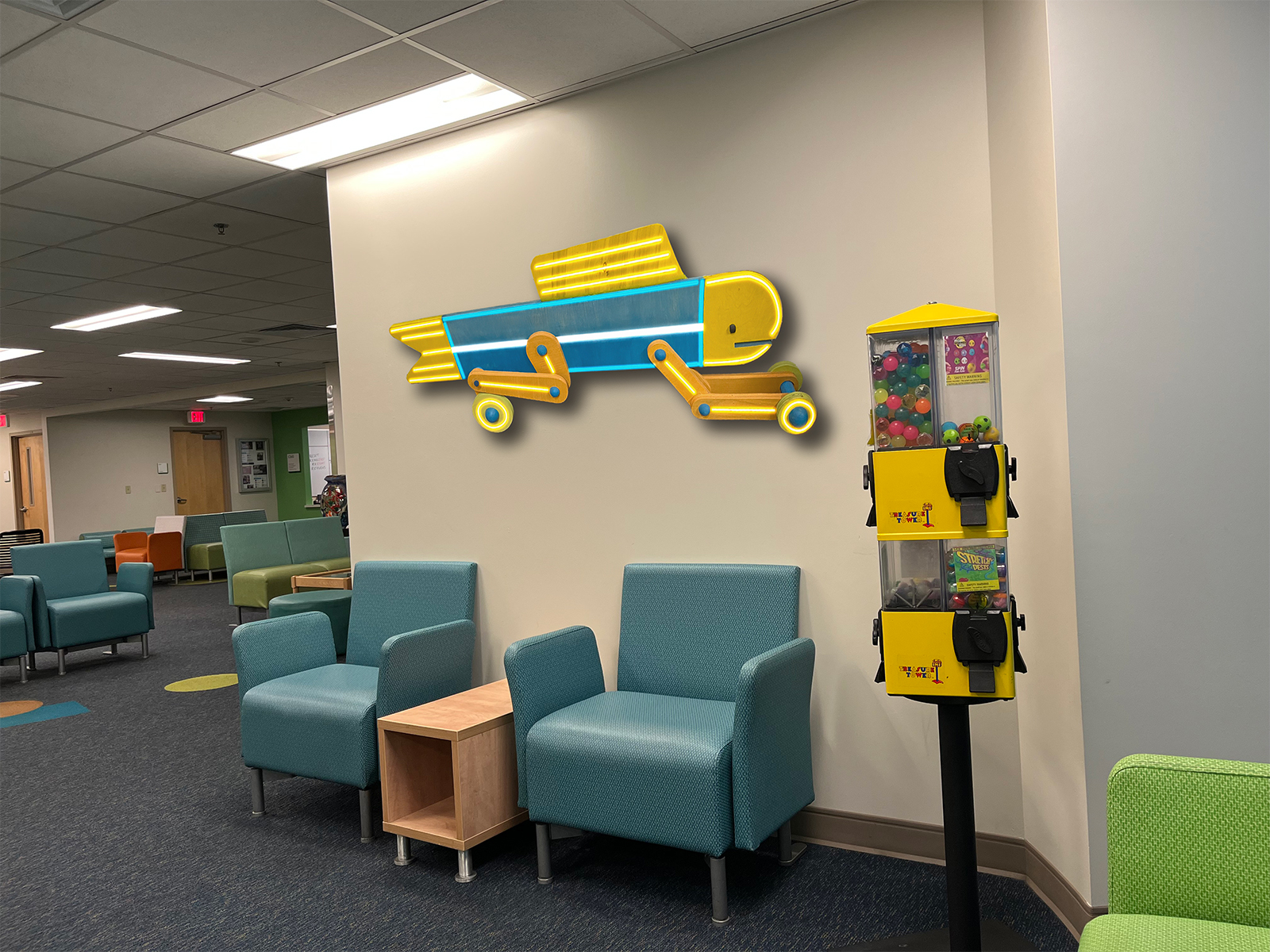 Created while working at Creative Arts Unlimited, this project transformed a children’s hospital waiting area into an immersive, playful environment designed to reduce stress and spark imagination. The space features large-scale illustrated murals of friendly sea creatures, whimsical flying fish, and outdoor adventure scenes that wrap around curved walls to create a cohesive visual journey. Dimensional elements and custom neon-style fixtures add depth and glow, turning flat graphics into engaging focal points that feel almost animated. Bright, approachable colors and soft organic shapes were chosen to create a calming yet uplifting atmosphere, helping young patients and their families feel more comfortable while they wait.