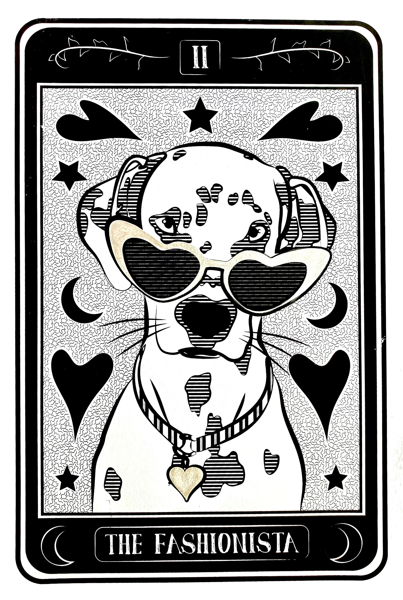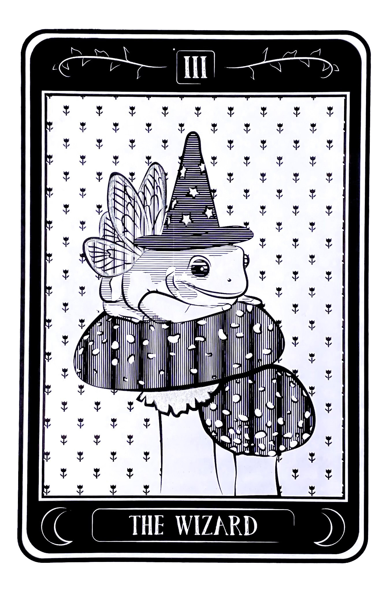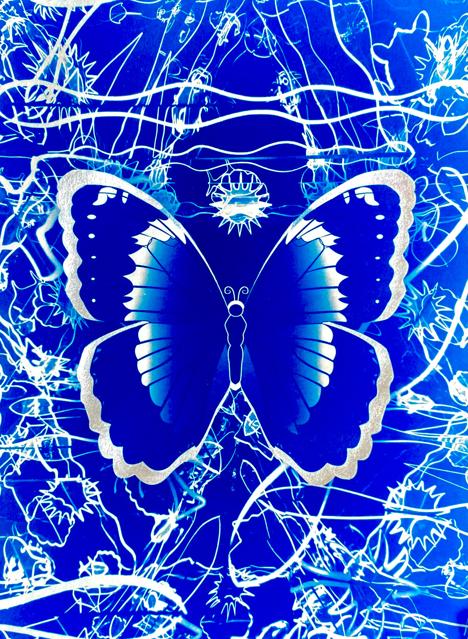 This collection brings together digital illustrations, screenprints, cyanotypes, and linocut prints that all share a slightly edgy, nature-inspired visual language. Animals and organic forms are used as storytelling devices, from a short comic capturing the chaotic humor of a cat abruptly waking its owner, to a whimsical tarot-inspired series featuring scenes like a wandering camper, a wizardly frog, and a sunglasses-wearing fashionista dog. Traditional printmaking processes add texture and unpredictability, with butterfly studies rendered through linocut and cyanotype techniques that emphasize contrast, silhouette, and natural patterning. The series is rounded out by a portrait of Tim Burton interpreted through his signature claymation aesthetic, blending homage with experimentation and reinforcing the overarching theme of surreal, slightly dark, but playful interpretations of the natural world.