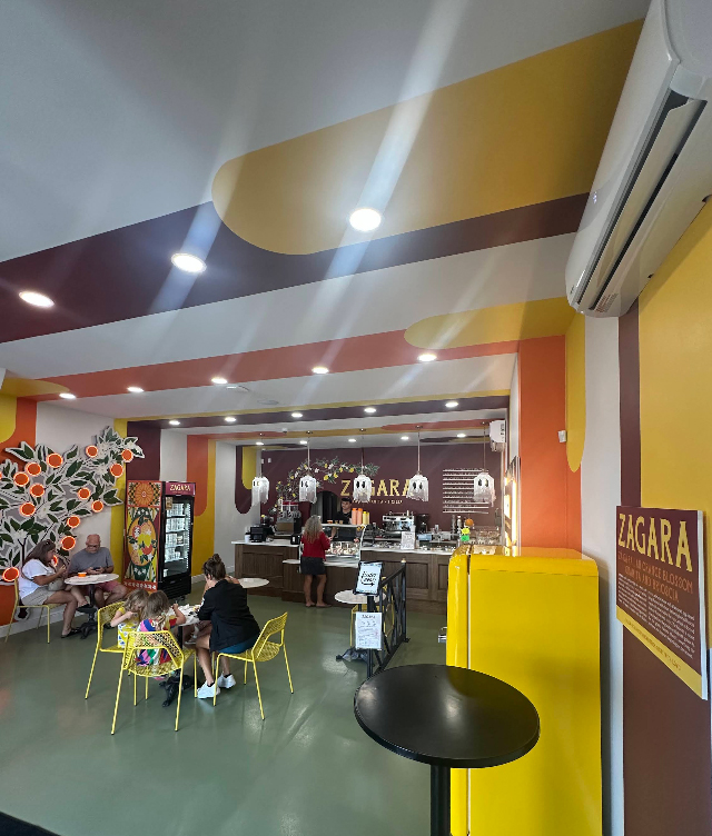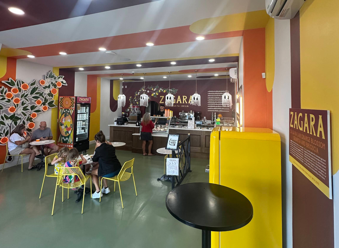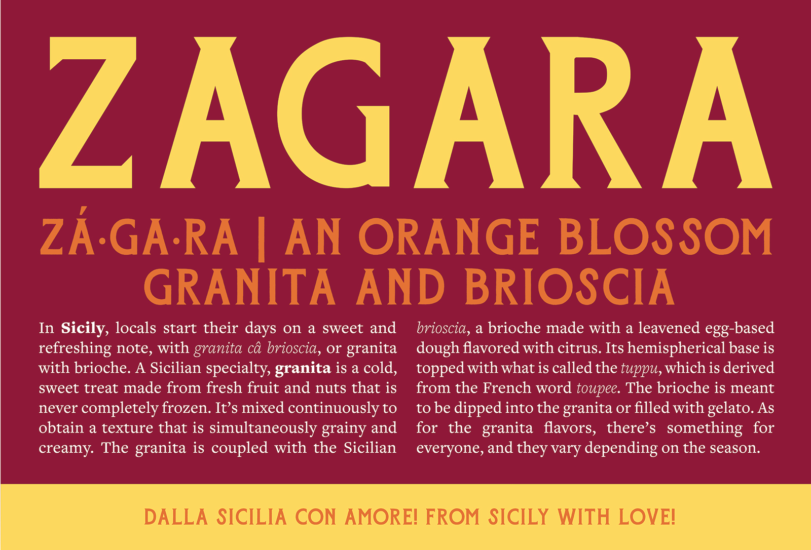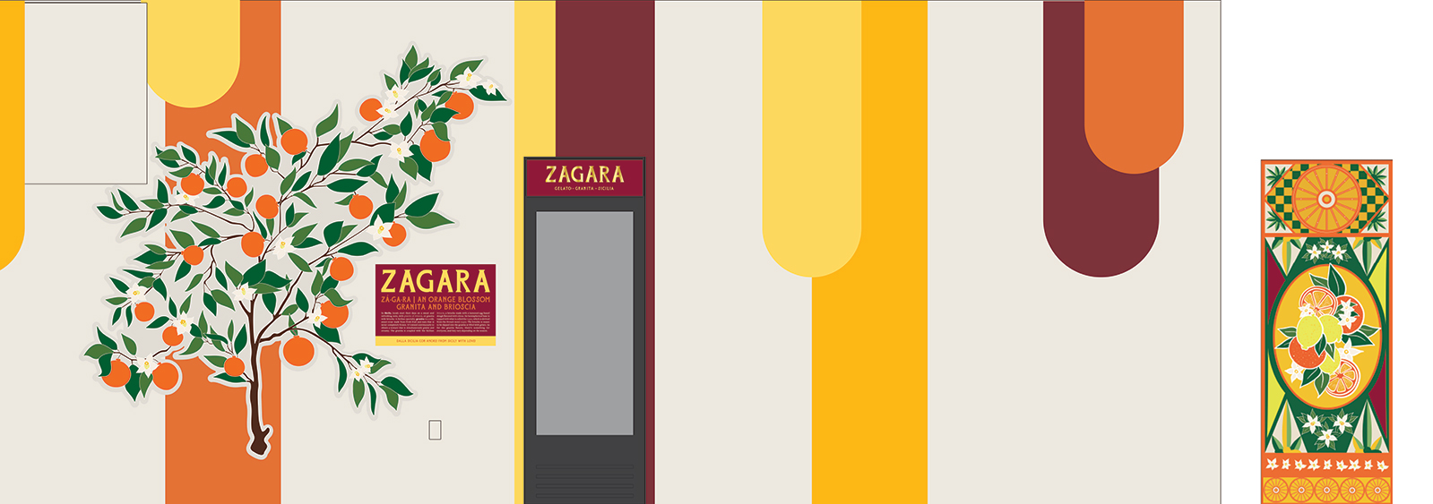 Working as part of the team at Creative Arts Unlimited, I helped develop and produce environmental graphics for Zagara Sicilian Gelato, a Sicilian gelato shop inside Mazzaro’s in St. Pete. My role focused on designing a custom informational plaque and a large-format fridge wrap that visually tied the space together through bold Sicilian-inspired colors, citrus motifs, and layered geometric shapes. The plaque combined typographic storytelling with cultural context about granita and brioche, while the fridge wrap translated the brand’s vibrant Mediterranean palette into a functional, eye-catching focal point within the shop. Collaborating closely with the production team ensured the graphics were not only visually cohesive with the surrounding mural elements and orange tree installation but also precisely prepared for print, fabrication, and on-site installation.