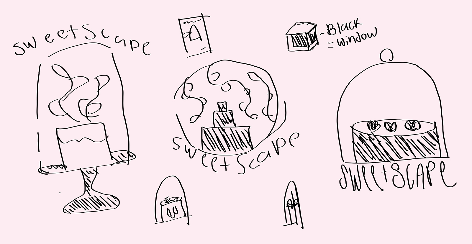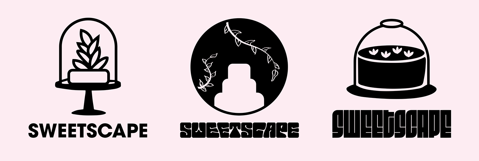 The initial sketches focused on translating the idea of a living terrarium into simple, recognizable silhouettes. Hand-drawn concepts experimented with domed glass covers, plant forms, and tiered cakes to find a symbol that clearly communicated both “dessert” and “botanical display.” These rough explorations were then refined into clean, minimal icons that could scale across packaging, labels, and small brand touchpoints. By reducing the idea to bold shapes and high-contrast marks, the final icons capture the whimsical, contained-garden feeling of a terrarium while remaining versatile and instantly readable as a cake brand.