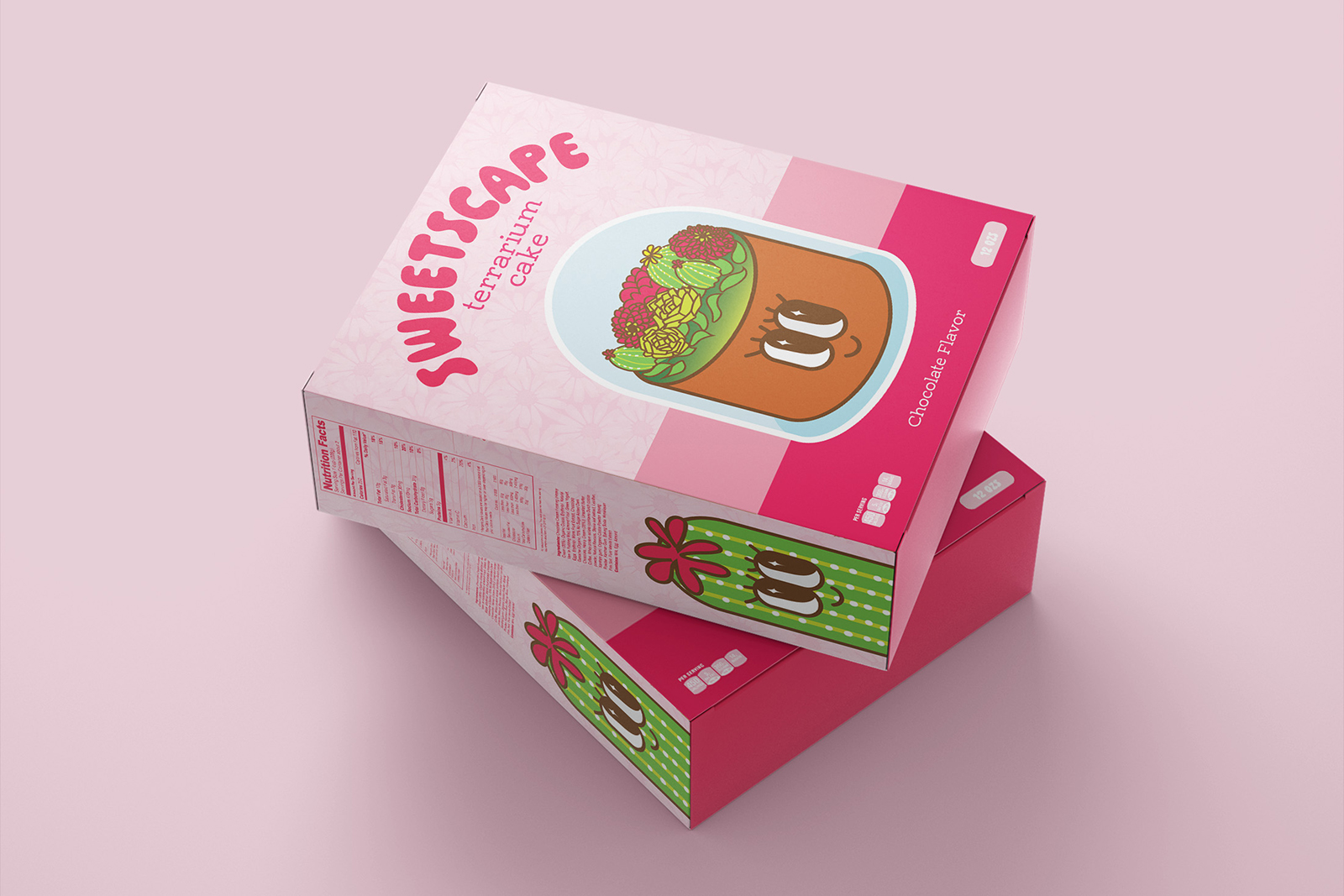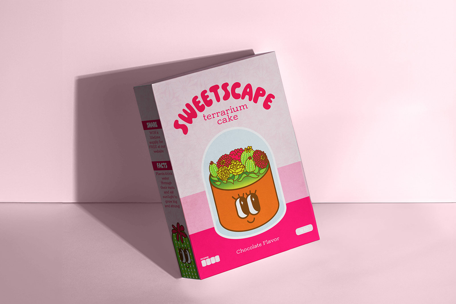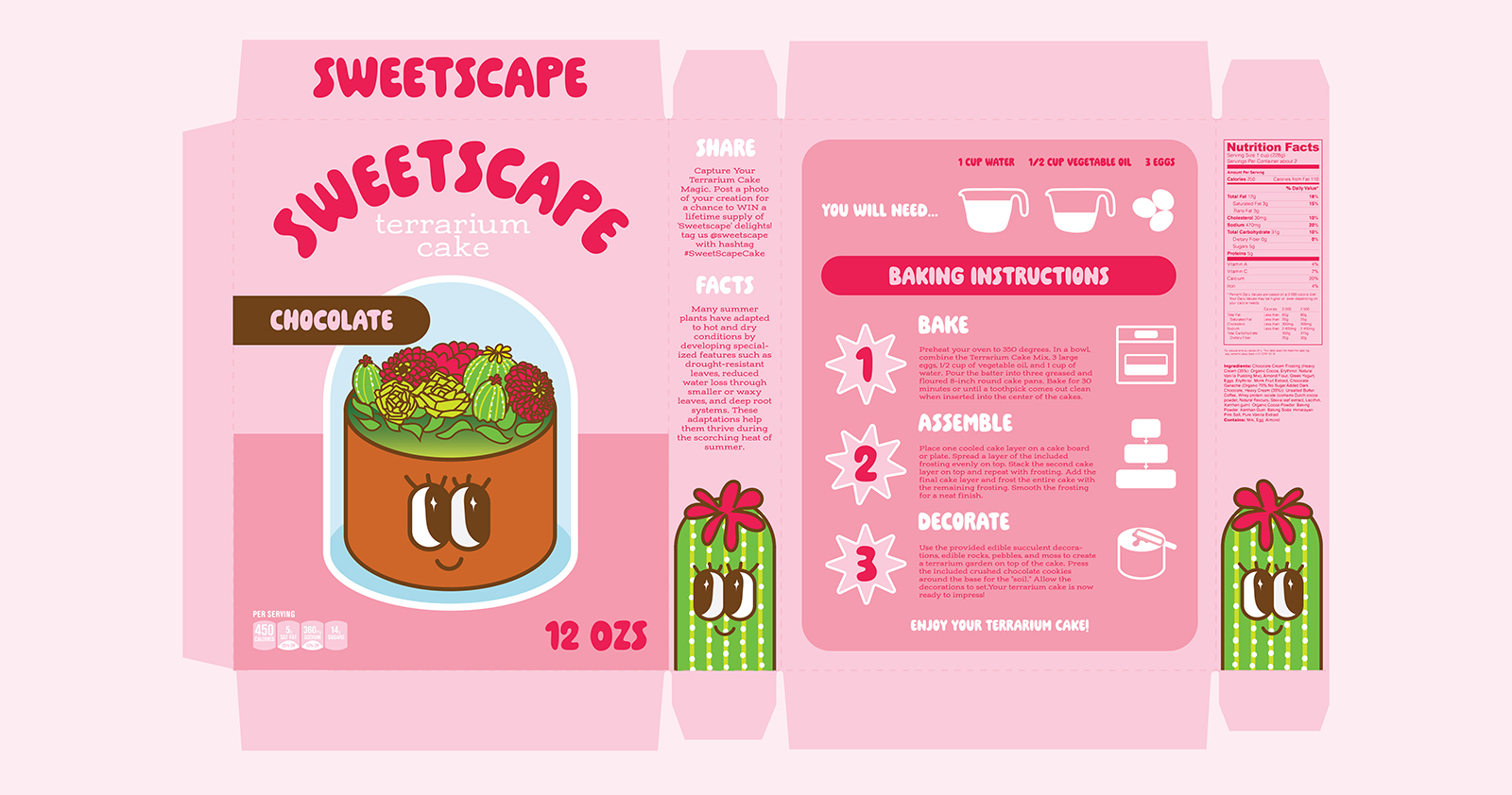 The flat dieline translates the brand into a fully functional, print-ready package that balances playful visuals with clear, step-by-step guidance. Large, friendly typography and the smiling terrarium cake illustration anchor the front panel, while the surrounding sides deliver instructions, ingredients, and decorative details in an organized, easy-to-follow flow. Soft pink tones and rounded shapes create an inviting, candy-like feel, and repeating plant motifs tie every face of the box together so the design remains cohesive from every angle once assembled.