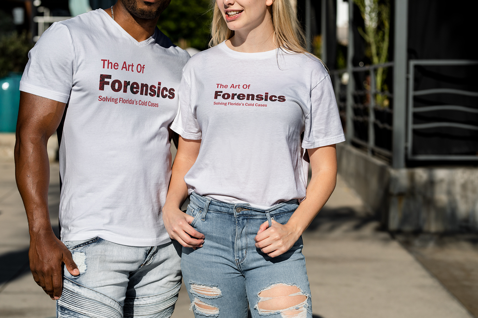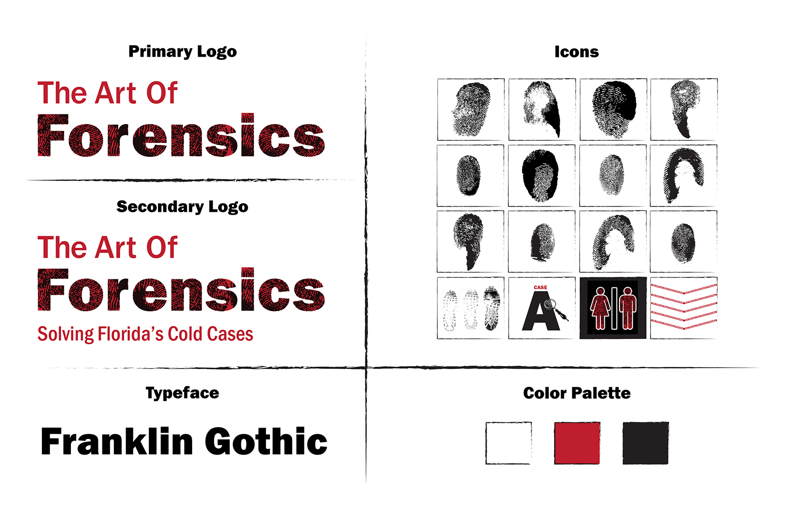 The identity system blends authoritative typography with fingerprint textures to express both scientific precision and human identity. Franklin Gothic provides a strong, institutional feel, while the distressed treatment of “Forensics” references trace evidence. A minimal palette of white, deep red, and black conveys urgency and respect. Fingerprint-based icons act as flexible markers across signage, apparel, and print, keeping every application rooted in the theme of uncovering identity.