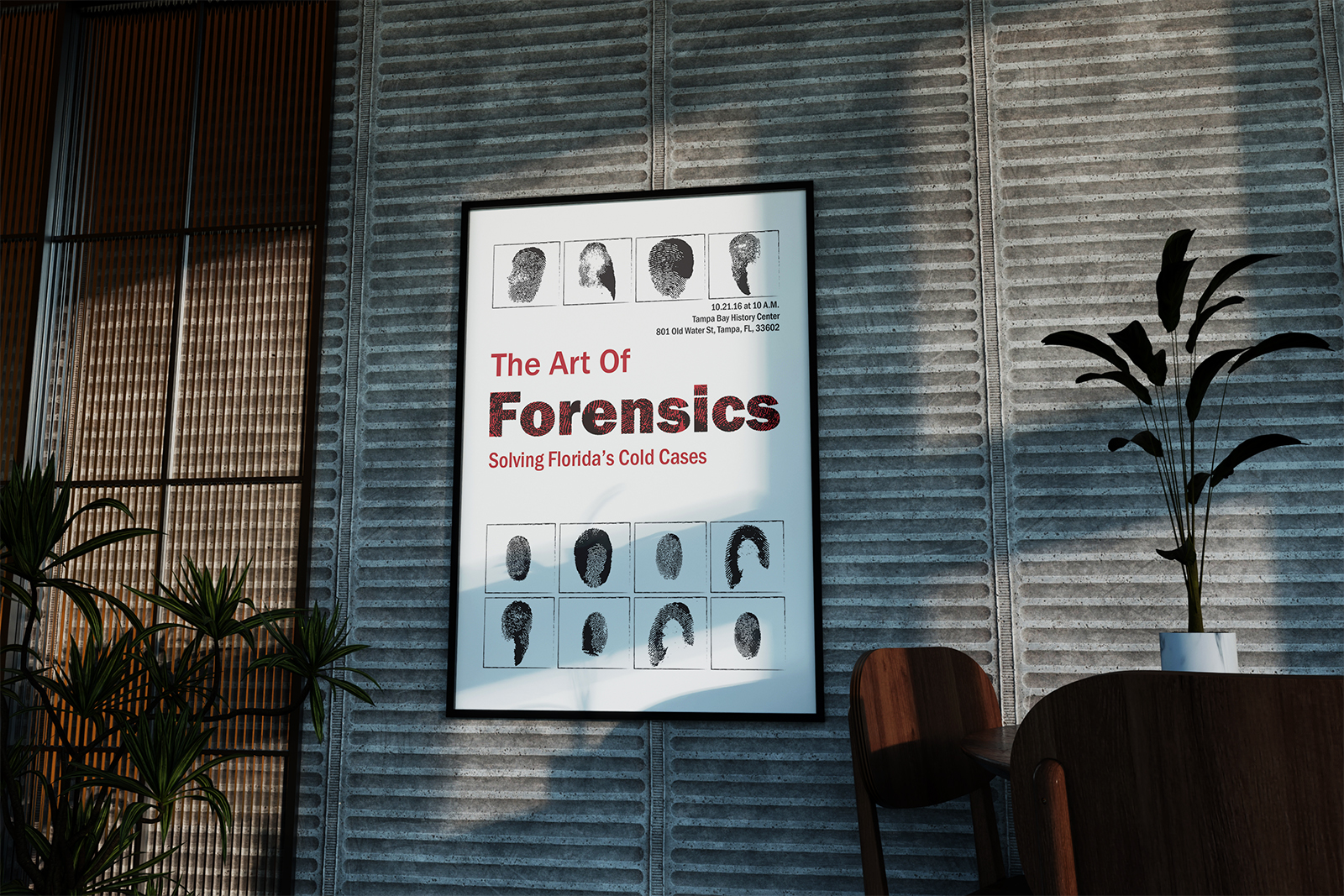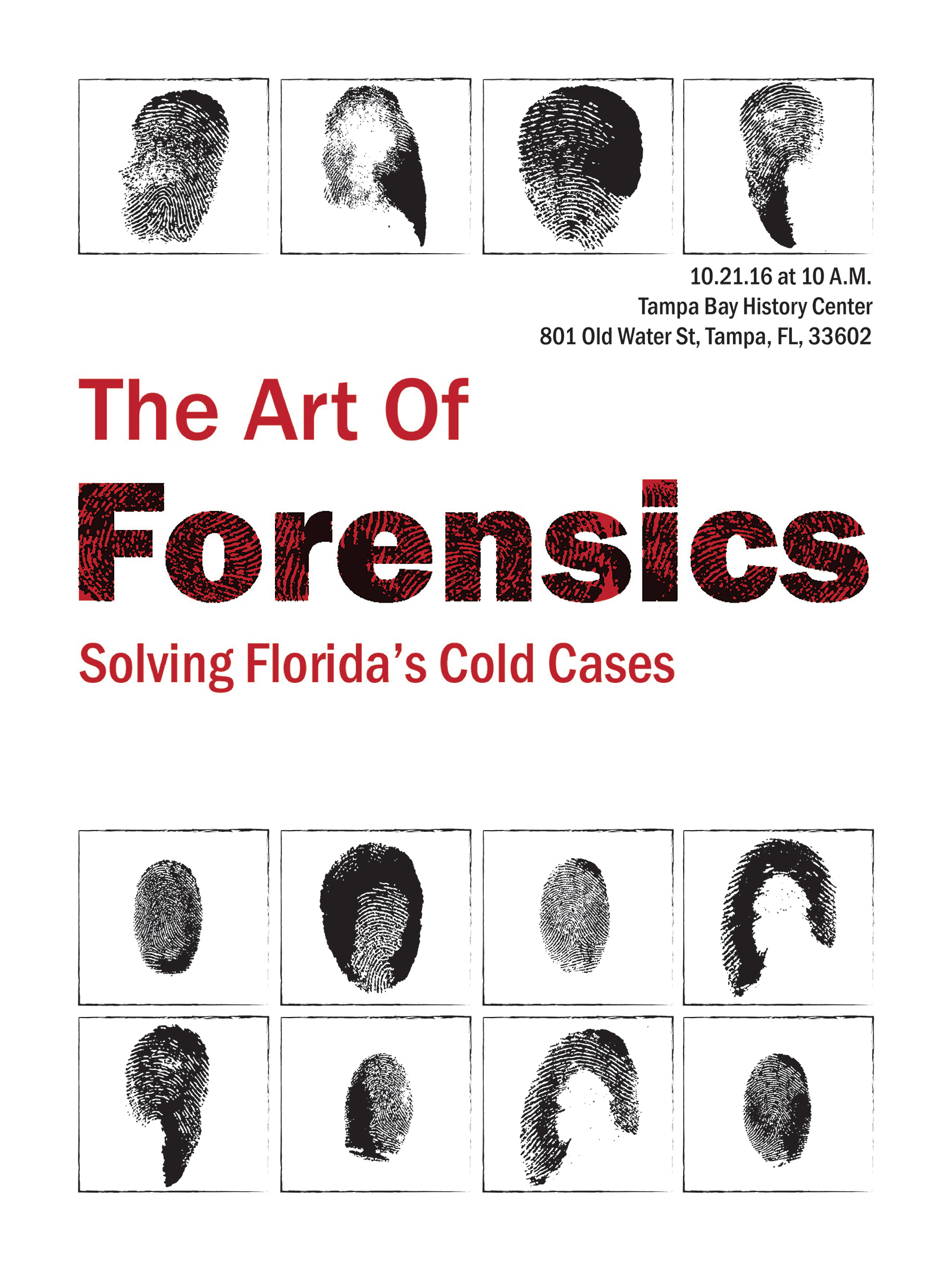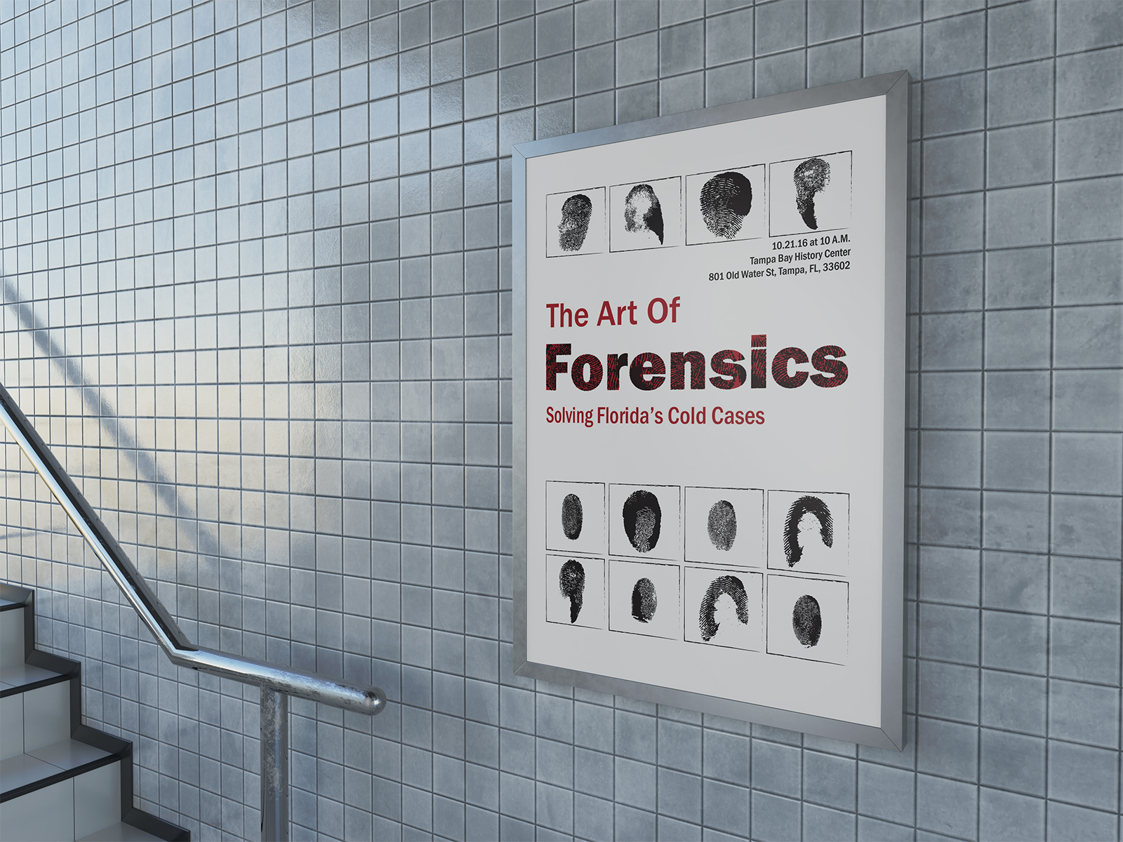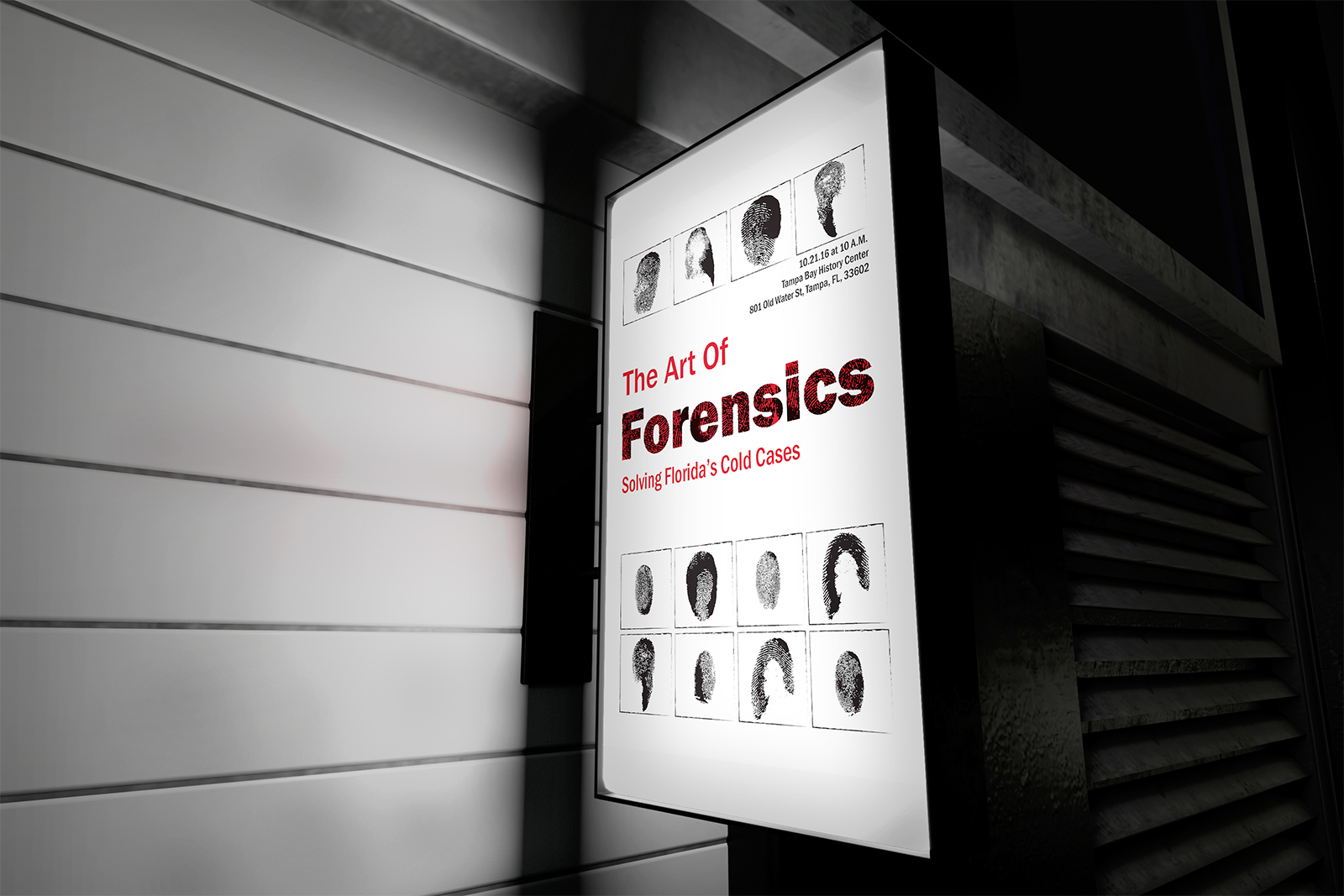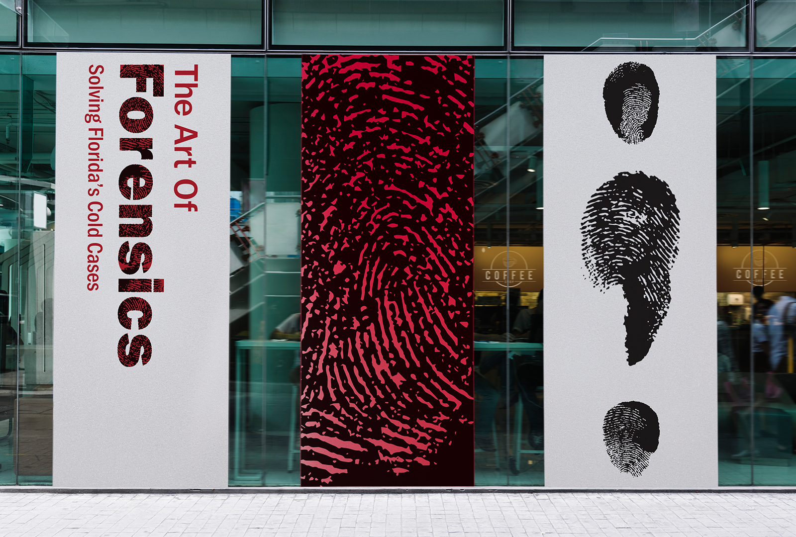 Designed for high visibility in public spaces, the poster pairs bold Franklin Gothic typography with fingerprint textures to instantly convey the forensic theme. Repeating fingerprint silhouettes frame the title, hinting at unknown identities and ongoing investigations, while a stark red, black, and white palette ensures strong contrast and readability from a distance. The clean, structured layout makes the exhibit’s purpose and details clear at a glance, creating an eye-catching yet respectful invitation to engage with the stories behind each case.