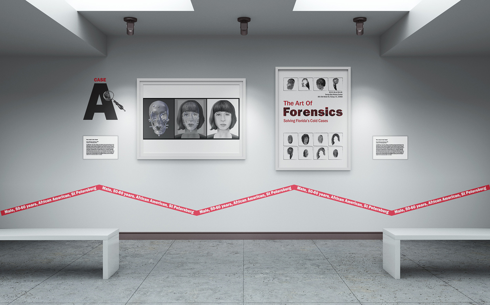 Within the exhibit space, each reconstructed portrait is framed by a minimal, museum-style presentation to keep focus on the individual, while a continuous red “caution tape” graphic runs through the room listing broad identifying details such as age range, location, and demographics. Small, discreet plaques beside each piece provide case-specific context, including where the remains were discovered and notable evidence from the scene. This layered system lets visitors quickly grasp essential facts from afar, then step closer to engage with the deeper investigative story of each unidentified person.