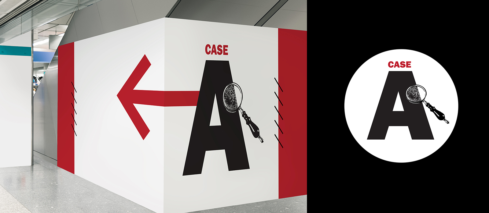 Bold typography, high-contrast red accents, and directional arrows create a clear, intuitive navigation system that mirrors the urgency and precision of forensic investigation. Fingerprint and footprint motifs act as visual trails throughout the space, guiding visitors between sections while reinforcing the exhibit’s central theme of identity and discovery.