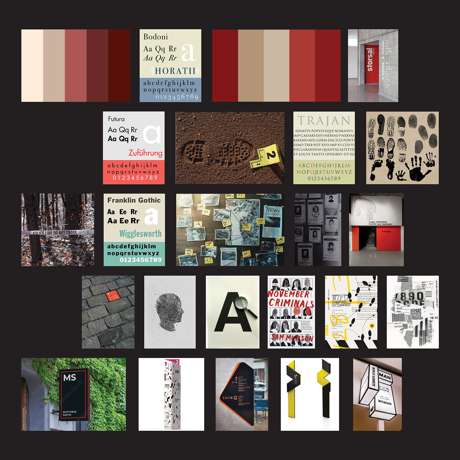 The moodboard establishes a balance between scientific investigation and human presence, combining evidence-inspired textures with restrained, museum-like typography. Deep reds, neutral bone tones, and muted earth colors reference both forensic markers and archival materials, while fingerprint patterns, ink bleeds, and impression marks suggest identity emerging from trace evidence. Clean, authoritative typefaces paired with bold directional forms create a wayfinding language that feels institutional and credible without becoming cold or clinical. Together, these elements guide the exhibit toward a visual tone that is investigative, respectful, and quietly powerful.